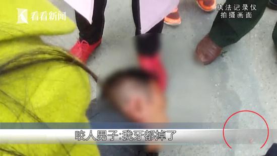 畫面中這名抱著交警腿的男子,分別在這名交警的大腿和小腿處咬了兩口,力量很大,不光咬傷了交警,還崩掉了自己的一顆大門牙。